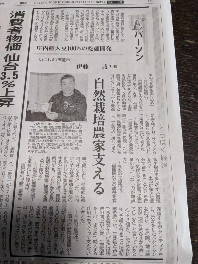 庄内の自然栽培大豆で、ソイ・プロテイン・ヌードル(大豆麺)のほか、お味噌、醤油、納豆などを作っています。