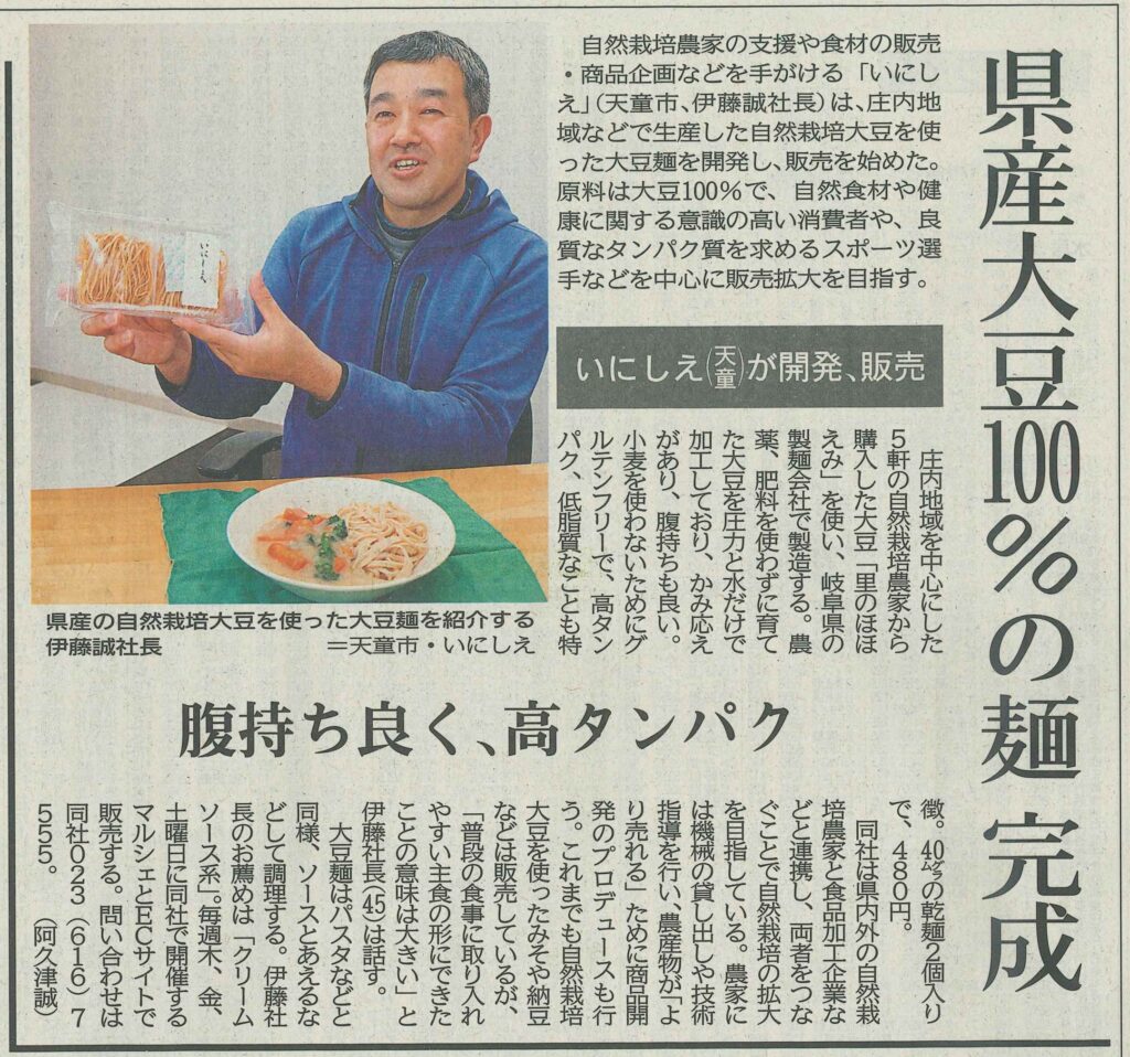 生産委託している庄内の自然栽培農家さんの大豆を使って作った 大豆麺を地元の山形新聞さんに取り上げていただきました〜、ありがとうございます! ここにも書かれていますが、アスリートの方にとても喜ばれると思うのです。 なぜならタンパク質リッチだから!